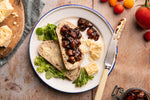 - Serve with serrano ham, goats cheese, chive, bresaola, a dollop of crème fraiche and rocket.