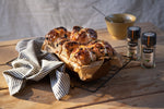 - Flatten out the dough again and spread with the cinnamon butter. Roll up like a swiss roll then slice into 8 equal pieces. To fit the 8 slices into a lined 2lb loaf tin, you’ll need to shape them a little, into slightly tighter rolls. It will be a tight fit but they will fit. Cover them loosely with a damp tea towel or oiled cling film, leave in a warm place for 40 minutes - 1hour to rise.