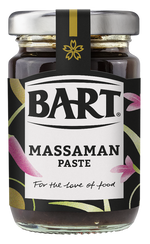 Pre-heat oven to 180°C/gas mark 4. Heat 1 tbsp vegetable oil in a pan until very hot, brown diced lamb and transfer to a casserole dish. In the same pan add the Bart Massaman Curry Paste, stir fry until aromatic and then add the ginger and onion - soften for 1-2 minutes before adding the coconut cream. Bring to the boil.