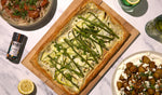 A goat’s cheese tart flavoured with mint, parsley, and feta, spread over flaky puff pastry. Topped with peas, courgette ribbons, and asparagus, it makes a simple yet delicious centrepiece for a vegetarian Easter lunch.Ingredients